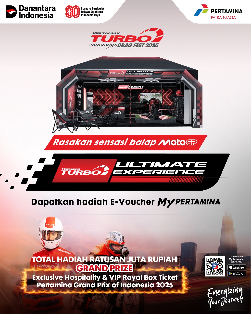 Pemenang kompetisi Pertamax Turbo Drag Fest 2025 akan mendapatkan hadiah berupa uang tunai dan E-Voucher MyPertamina dengan total puluhan juta rupiah. Para pemenang juga berkesempatan meraih Grand Prize berupa paket exclusive hospitality dan VIP Royal Box ticket Pertamina GP of Indonesia 2025.