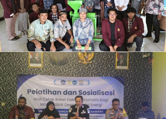 KARAWANGBEKASI.DISWAY.ID - Tim Pengabdian kepada Masyarakat (PkM) Fakultas Teknik Universitas Singaperbangsa Karawang melaksanakan kegiatan sosialisasi teknologi pembuatan briket sekam padi di Kantor Desa Karang Harum, Kecamatan Kedungwaringin, Kabupaten Bekasi.