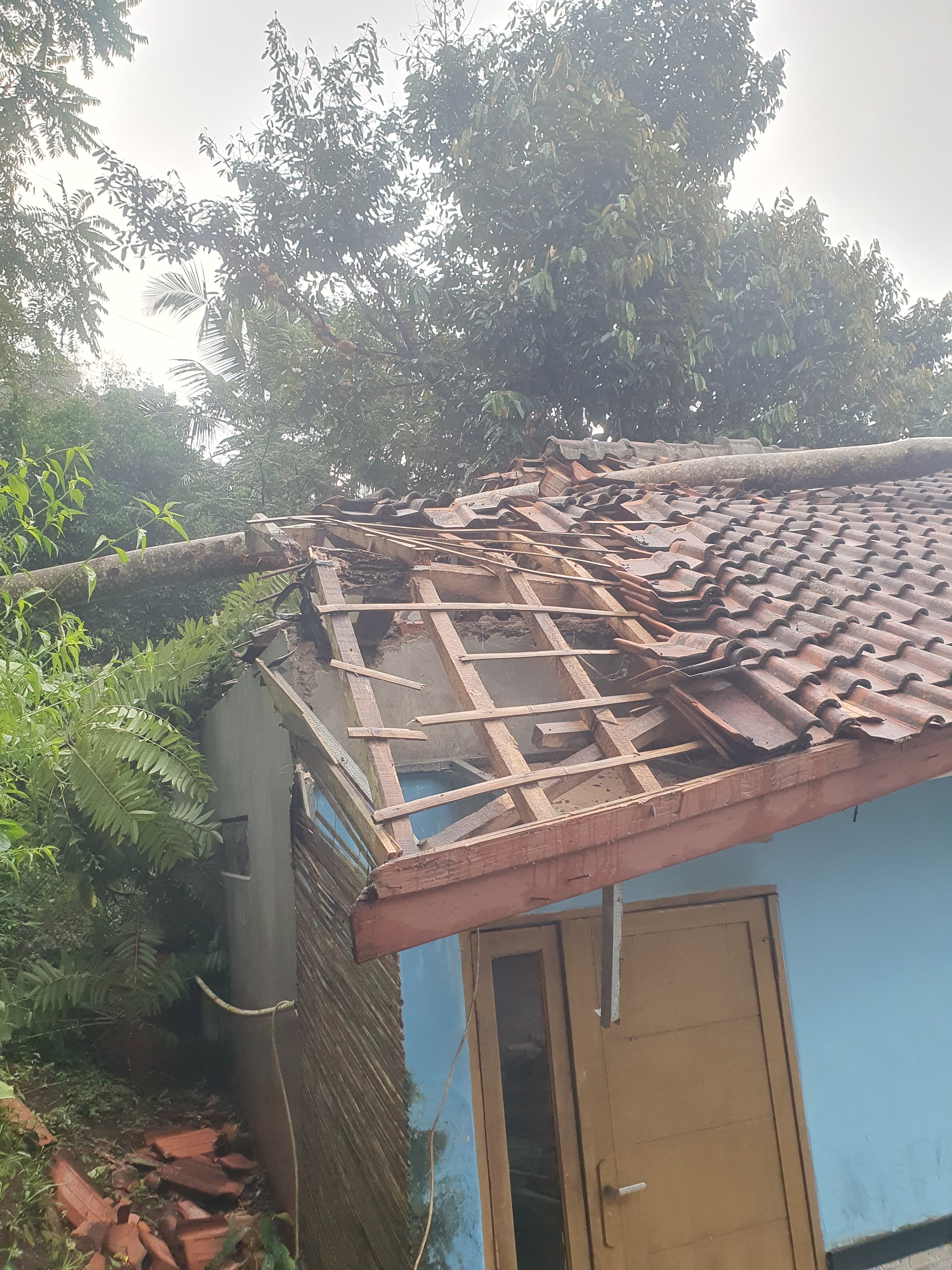 SUMEDANG, KARAWANGBEKASI.DISWAY.ID - Satu unit rumah tempat tinggal dan kandang ayam permanen milik warga hancur tertimpa pohon besar sepanjang sekitar 10 meter di Lingkungan Kebon Seureuh RT 04 RW 05, Kelurahan Cipameungpeuk, Kecamatan Sumedang Selatan, Kabupaten Sumedang.
